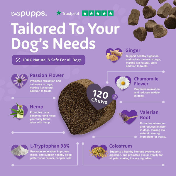 Pupps Calming Dog Treats are designed to help your dog relax and reduce anxiety. Made with natural ingredients like hemp oil, organic chamomile, and L-tryptophan, these treats are perfect for...
