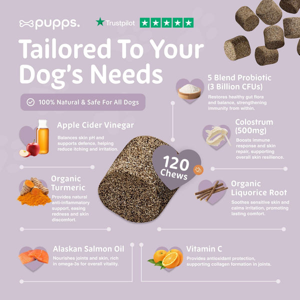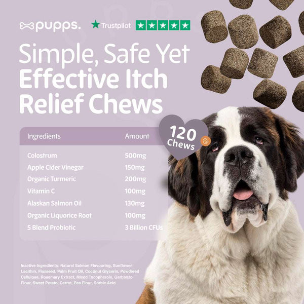 Relieve your dog's itching with Pupps Itch Relief Dog Treats. Formulated with natural ingredients like turmeric, quercetin, and omega-3 fatty acids, these treats soothe itchy skin and reduce inflammation, making...