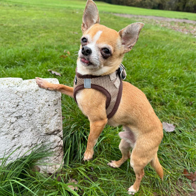Introducing the NEW Chocolate Caramel Tiny Trails Step-In Air Mesh Puppy & Small Dog Harness from My Chi and Me. This harness is a perfect match with our caramel webbing...